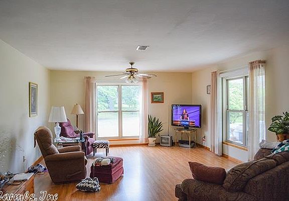 Charming home on 6 acres with workshop is now available close to Greers Ferry Lake. Oversized living room, den and sunroom offers handicap design which is flooded with sunshine and views of the acreage. Watch wildlife from the sunroom in back or the porch swing on the long covered front porch. Great country home with detached shop with electric/water, fenced vegetable garden, 100 yr old Concord Grape vines, storage, canning room & office. 2-250 gal propane tanks convey. (sq ft approx)
