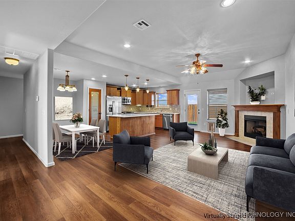Seller concession $10,000.00 to go towards closing costs or interest rate buydown! This home checks all the boxes! This home offers an accessible, move-in-ready, single-story layout with 4 bedrooms, 2 baths, complete with a full home generator that ensures you have all the power you need in every room, all the time, plus a walk-in storm shelter in the master bedroom closet. Gather with loved ones in the inviting open concept layout perfect for entertaining, featuring new quartz countertops and all new stainless-steel appliances, including a gas range with convection oven and air fryer, creating a culinary haven that joins seamlessly with the dining area and spacious living room with a corner gas log fireplace. Retreat to the coziness of new plush carpet in three of the bedrooms, while the extra-large 4th bedroom, main living areas and hallways showcase durable vinyl wood laminate flooring, marrying style with practicality. The 4th bedroom is perfect for projects/hobbies or home schooling! Indulge in the luxury of the master bedroom suite with tray ceiling, and master bath with a dual vanity, whirlpool tub, separate shower with fold down seat, walk-in closet with walk-in tornado shelter, offering a safe and serene sanctuary for relaxation.