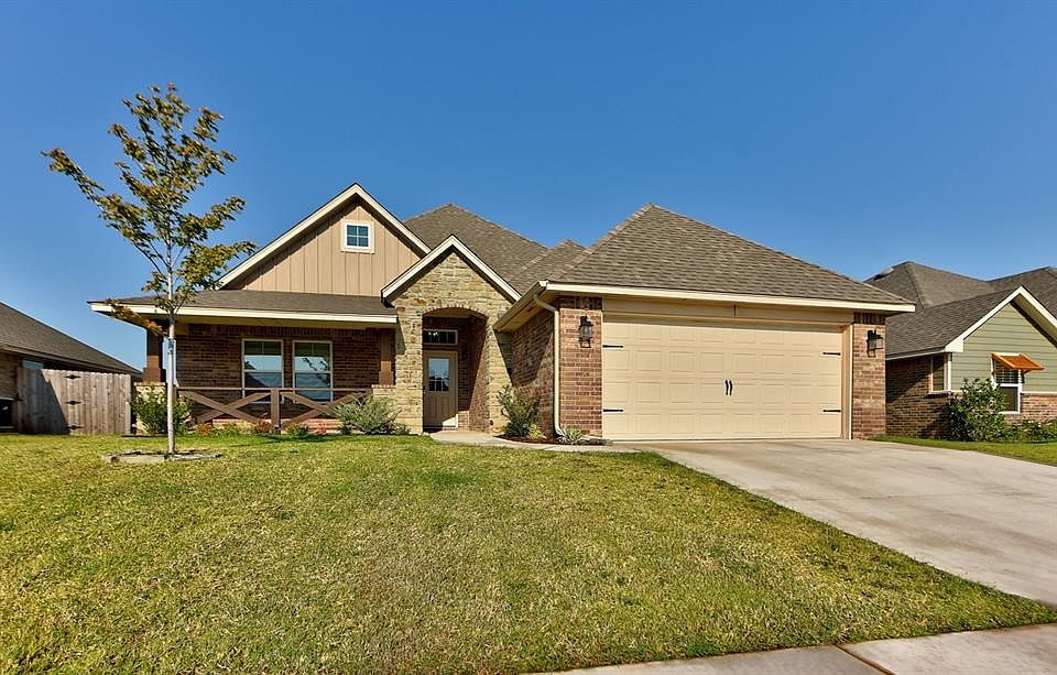 Discover your dream home in the coveted Grove community! This stunning move in ready home features a charming covered front porch and offers 3 spacious bedrooms, and 2 baths. Upon entering, you'll find a versatile flex room that can be tailored to your needs—whether as a home office, playroom, or game room. The open-concept kitchen and living area is perfect for entertaining, boasting a large kitchen island, pullout drawers, elegant wood-tile flooring, and a cozy gas fireplace. The primary suite is a serene retreat, located at the back of the home for added privacy. It includes a generous walk-in closet, a luxurious shower with Schluter waterproofing, and a relaxing 6-foot tub. Two additional bedrooms share a stylish full bath and offer ample closet space. Step outside to enjoy a fully fenced backyard featuring a covered patio and a beautiful outdoor fireplace, ideal for gatherings or quiet evenings. The home is equipped with a tankless water heater, ensuring you'll never run out of hot water, a full sprinkler system, and a storm shelter. Located within the Deer Creek School District, this home is part of the highly desirable Grove community, which includes family-friendly amenities such as a pool, park, basketball court, clubhouse, and more. With direct access to Highway 74, you'll enjoy convenience and proximity to everything you need.