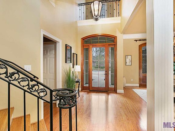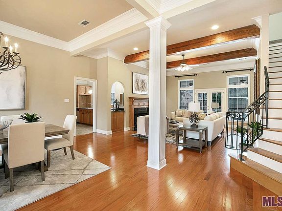 You will not want to leave this well thought out custom built home once you arrive! What's not to love from the views of the beautiful sparkling pool, the tall ceilings with cypress beams, wood flooring with the iron stairway opening into the foyer and an oversized keeping room off the kitchen. Living room's fireplace has gas logs & there is a separate foyer to the master bedroom and another small foyer to the guest bedroom & bath both downstairs. Beautiful wood windows overlook the dining room you will appreciate the counter space and cabinet into and shared with the kitchen. You'll also appreciate having a study with built-in's on the main floor and there is more storage in a butler's pantry in the hallway. The kitchen has slab granite counter-tops, a good sized island with a breakfast bar, a walk in pantry, and stainless appliances, including a new 5 burner gas cooktop and microwave. The keeping room is brightened by wall of windows overlooking the pool and back yard. The master bedroom has wood flooring, tall windows, views the pool and has access to the covered back patio with New Orleans style iron post. Master bathroom has his/her vanities and a large walk in closet with separate areas. The second floor has a bonus room with bookshelves and cabinets & both bedrooms have their own private bathrooms and one has a sitting area. The large pool has three fountains, a hot tub for this time of year and an arbor. Home has curb appeal galore with iron railing balcony viewed from the street. Newer wood flooring in the living, dining and master bedroom. Home has a security system and has exterior cameras and remodeled 1/2 bath downstairs and has never flooded. Don't miss out on this one. Make your appointment today. Home staged by Stage Presence - Andi Holliday.