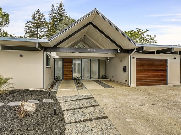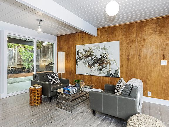 Mid-Century meets Modern in this exceptional, updated Double Gable style Eichler home designed by renowned architect Claude Oakland and built in 1963 in the heart of the highly sought after Greenridge community of Castro Valley--The home sits on a large, flat .31 acre lot--Custom solid wood entry door welcomes you into the serene signature atrium with relaxing new modern water feature that brings the outdoors in and leads you directly into the open and impressive great room with stunning natural light--The Eichler style is evident throughout with original solid wood beams, tongue and groove wood ceiling planks, 8+ ft walls and dramatic floor to ceiling tiled wood burning fireplace--Spacious single level floor plan of over 2,000 sq. ft. featuring 5 ample sized bedrooms and 2 remodeled bathrooms including an amazing master suite complete with gorgeously remodeled private bathroom with spa-like luxury dual showers and Bluetooth lighted fan--Stunning chef's delight kitchen with huge quartz waterfall island and breakfast bar featuring soft-close custom cabinetry with ample storage and quartz countertops with Carrera marble backsplash. All new stainless steel appliances including deluxe built-in Wolf oven, Wolf induction cooktop, microwave drawer, wine cooler, stainless and glass hood, and Samsung Storm dishwasher as well as a large walk-in pantry--Bright and airy with walls of glass, 7 sliding patio doors, and skylights throughout