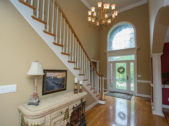 Welcome home to this meticulously kept 1.5 story, one owner home. Overlooking the large pond with fountain at the entrance, this home is conveniently located in the front of the subdivision. Upon entry you will see beautifully kept hardwood floors in this wonderfully open floor plan, which is great for entertaining. The large eat in kitchen has an abundance of custom cabinetry with pull out drawers, granite countertops, tile backslash, black appliance package, and a breakfast bar. The eat in area leads out onto a covered porch that then parlays to an open air patio, a wonderful spot to barbecue and hang out with friends and family. The kitchen is also open to the great room which has soaring ceilings, a wall of windows, and a gas fireplace flanked by built ins. The formal dining room has a trayed ceiling, arched entries, and 7 columns and is also open to the great room. The convenient first floor master bedroom is tucked away and private. The large master bedroom has a hip vaulted ceiling with rope lighting. It also has a wonderful large master bathroom, again with custom cabinetry, double vanity, jetted tub, tiled shower with new shower door, private toilet, and a large walk in master closet. Upstairs you will find a bowed catwalk and 4 large bedrooms (all can accommodate a king sized bed comfortably) and 2 full baths. One bedroom has it's own private bath and could be used as another master, and the other bathroom is a Jack & Jill. There is plenty of room to spread out in the basement with a family room with built in entertainment center, an area for a pool table, an area for a ping pong table, an area for a shuffle board table, and a bar area with custom cabinetry, granite countertop & sink, and another full bathroom. Extras in this home include: a central vacuum system, crown molding on all 3 levels, blinds throughout, niches with lighting, security system, built in speaker system in the great room and basement, exterior speakers on the covered porch, mature landscaping, irrigation in the front and back yards with a separate water meter, invisible dog fence, wired for a generator (has separate 6-zone panel), humidifier attached to furnace, zoned HVAC, 1 new AC unit, and a battery back up on the sump pump.