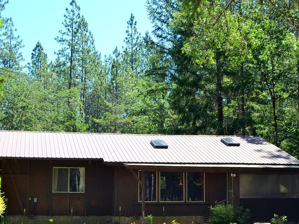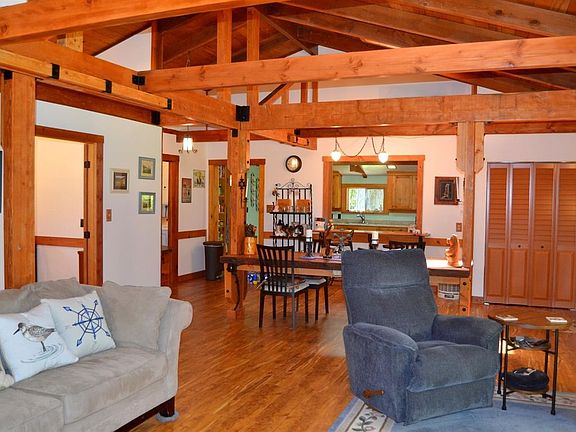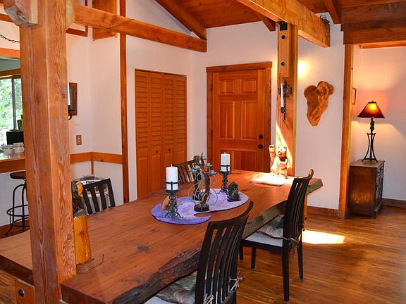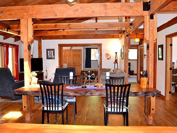 Wonderful updated home located on over 6 nicely treed level acres, just 5 mins from town. Home features vaulted open beam ceilings and skylights, lots of natural light. Recent updates include painting, laminate flooring and kitchen remodel.Third bedroom currently being used as an office and does not have a closet. Masters bedroom opens to the living room with barn doors, (has additional door leading to the hallway). Daikin energy efficient home heating unit. Amazing wood working throughout this home.Property features many walking trails through the trees. The several out buildings include two room log cabin serving as art studio and wood working shop. Newer metal detached 30'x 32' Garage/workshop, also a carport for parking. Large shed being used for wood. There is so much here, need to tour to appreciate.