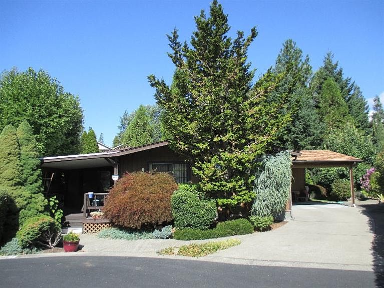 Lovely 1716 sq/ft home in Allen Creek Estates, where you own the land and the home, features 3BR and 2BA in a 1987 Golden West model. Set on one of the most desirable lots in this Over 55 community, there's a shady backyard and patio bordered by Allen Creek. Light and bright inside, there are vaulted ceilings and spacious rooms, with double doors leading to the 3rd bedroom, which can double as a den. In the kitchen there are up-to-date appliances, double ovens, oak cabinets and skylights that brighten the room. Beautiful built-ins add character to the dining room. Outside, an over-sized front porch offers cool and quiet in the afternoons, and out back, there's a ramp to the side door (if you need it), generous covered parking for two vehicles plus a large shop/storage area. This wonderful community is just blocks from Three Rivers Hospital, medical offices and shopping. Homeowners monthly fees are $75 and include use of a Club House on the grounds.