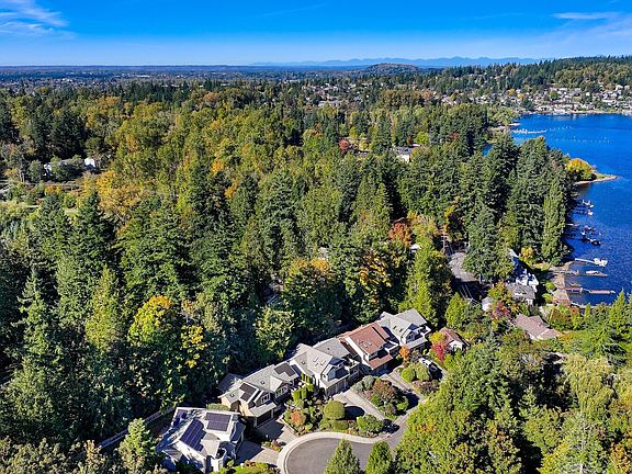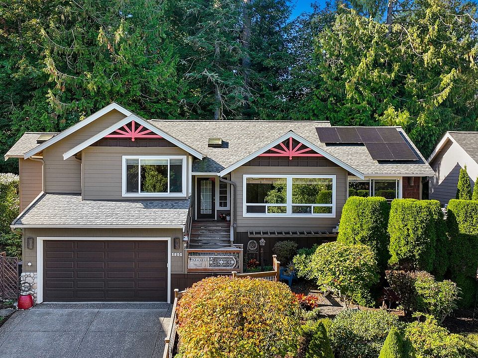 Tucked away in one of Bellingham's most peaceful and private cul-de-sacs, this beautiful Kenoyer-built home is a true retreat surrounded by mature trees and lush landscaping. Vaulted tongue & groove ceilings in the living room and primary bedroom, rich natural wood, and skylights with powered blinds fill the home with warm light. A two-sided river rock fireplace connects the living and dining areas, while the kitchen’s breakfast nook and deck spaces invite slow mornings or relaxed entertaining with peaceful views of Lake Whatcom. The upper-level primary suite offers a large walk-in closet and full bath. The entire interior has fresh paint, along with AC, solar panels combine comfort, sustainability and a timeless craftsmanship vibe.