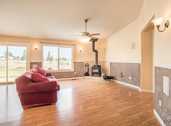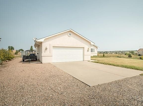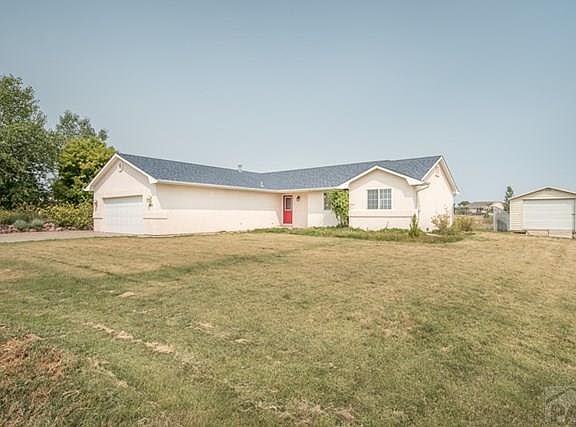 Pueblo West Home with Pikes Peak views. You will love the open floor plan with vaulted ceilings in Living room, Dining room and Kitchen. There is also amazing natural light throughout the living space. Living room with wood burning stove and laminate wood floors that extend into the dining room with access to the back patio. The kitchen has tile flooring, breakfast bar, gas stove and plenty of cabinet space. Master Suite with large closets and bathroom with garden tub and walk in shower. Remaining 2 Bedrooms share a full bath. This home sits on 1.01 acres Yard has sprinkler system front and back with Buffalo grass. Fenced back yard and 15X20 metal shed. This home is move in ready! NEW Roof! Countertop in kitchen is on order and will be installed prior to closing
