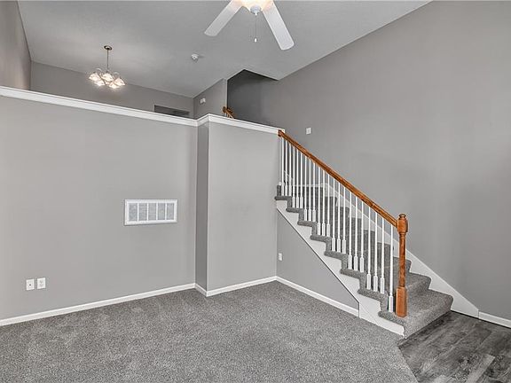 This townhome is located is a trendy & popular Western Olathe area full of retail, close to highways and new high school. The 2 bed, 2 bathroom townhome is right where you want to be. The eat-in kitchen features plenty of cabinet space and open to a hearth room with fireplace & a sliding door that leads to a bistro deck. The main floor also has a formal dining and that looks over another living space with vaulted ceilings. Bedrooms are very nice sized, each room has their own closets and bathroom. Laundry is conveniently located on the 2nd level. The primary has a nice size bathroom with tub and shower. The lower level features a garage, mud room and sub basement great for storage or an unfinished rec room. Newer HVAC.