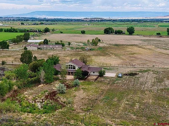 Spectacular horse property set up south of Montrose on 43.5 irrigated acres. With some TLC this horse ranch can be returned to a gem of a property. This amazing and private location is bordered by Dolores Creek on the west boundary and boasts views of the beautiful San Juan Mountains. The 85’x36’ horse stable features 10 stalls with 6 attached runs, waterers in each stall, tack room, covered front porch, and office that includes a ¾ bathroom and washing machine hookup. There is a breezeway connecting the stable to the 72’x48’ equipment shed with power and concrete floor. The 300’x225’ arena located just north of the stable has hosted many horse show events in the past. There are several horse pastures near the stable and arena. The property also boasts large flat fields ready to return into hay fields or make it what you want with the underground water delivery system. The 2 greenhouses and a small portion of the irrigated pipe still remain on the property. The home offers 4 bedrooms and 4 bathrooms that include two separate master suites. The main living area is ideal for entertaining and includes a large kitchen with island and bar seating, with tall ceilings, fireplace and sun filled south facing windows in the living and dining room area. The second floor offers two bedrooms, bathroom, a sitting area and fireplace. Relax after a long day out back on the rock patio, firepit, covered porch and horseshoe shaped pond. The previous owners converted the two attached garages located on each end of the house into space for business purposes. Continue to use as business or living space or convert back into garage space. There are so many possibilities for you to make this property what you want.