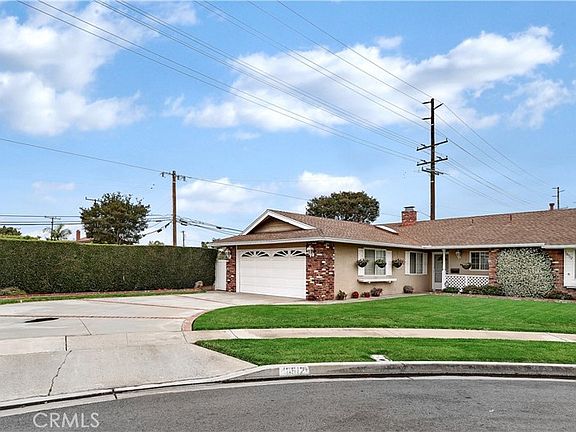 Beautiful home located in a quiet cul-de-sac, offering great curb appeal with large driveway adorned with brick ribbon accents, walkways and raised planters. New sewer line from street to house just installed for over $14k. A/C, Dual pane windows and water softener. The interior boasts a mix of hardwood and carpet flooring, creating a warm and inviting ambiance. The Skylight fills the space with natural light, window and door case moldings, interior raised panel doors and crown molding further enhance the sophisticated feel of the home. The kitchen has been tastefully upgraded, featuring granite counters, solid wood custom cabinetry w/glass display fronts and convenient pull-outs. The breakfast bar provides seating and additional storage. A convenient inside laundry room w/ample storage, an additional half bathroom along with direct garage access. The living room is a cozy retreat, highlighted by a pretty brick center fireplace with a wood mantle and glass doors, recessed lighting and a large French slider door opens up to the private backyard, seamlessly blending indoor and outdoor living spaces. Master bedroom features crown molding, a unique window ledge area, a ceiling fan w/a light, and a private attached bathroom. The master bathroom is well-appointed, with a walk-in shower boasting tiled surround & glass door. The upgraded guest bathroom includes additional linen storage, dual sinks, modern mirrors & lighting fixtures and a tub/shower combo with a tile surround. Step outside into your own backyard oasis. A newly refurbished patio cover provides a shaded area to relax and unwind. An above-ground spa offers a perfect place for relaxation. The stained concrete patio w/brick ribbon accents adds charm to the outdoor space. Raised flower beds showcase beautiful flowers & fruit trees, creating a vibrant and fragrant atmosphere. A large grassy area shaded by an avocado tree provides a perfect space for outdoor activities and block wall surround w/vinyl topper ensures privacy. It's an ideal place to create lasting memories and enjoy a comfortable lifestyle.