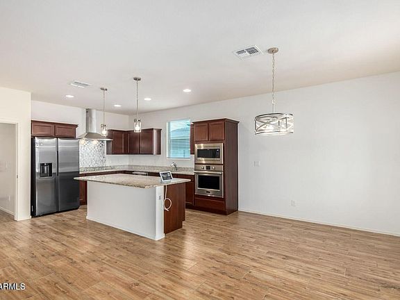 Located in the vibrant community of North Copper Canyon, this home offers access to 4 beautifully designed community parks featuring playgrounds, splash pads, basketball, volleyball, and pickleball courts, dog parks, BBQ pits and scenic walking trails. Enjoy an active lifestyle with regular Food Truck Days and community events—all conveniently located just off 183rd Avenue. Perfect for families and outdoor enthusiasts seeking fun, convenience, and connection in one place! This stunning 5-bedroom residence features a 2-car garage, RV gate, and tasteful paver driveway. Venture into a soothing living room with a serene palette and stylish wood-look flooring. The great room boasts high ceilings and seamless backyard access for indoor-outdoor living.