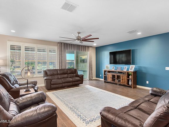 Pristine home with luxury details throughout on a great lot w/amazing sunsets and mountain views. Massive open floorplan w/entertainment in mind. Kitchen is the focal point w/stunning granite countertops, large island, gas cooktop, walk in pantry. Relaxing master suite w/super shower, huge walk in & double sinks. Calming fresh neutral palate, high end shutters, plank wood style tile, shaker style doors and sunscreens throughout. Laundry room has both freezer and extra fridge. Additional work/office space is ideal for storage or play area. Lovely secondary bedrooms, one w/walk in closet. Huge RV Garage has pass through door, RV gate, 2G, epoxy floor, built in cab and work area. Tranquil backyard w/waterfall feature, gas firepit, build-in BBQ, high-end pavers, and artificial turf.