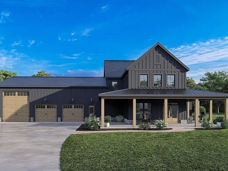 Popular Bardomenium style home situated on 5 acres of private land where a modern exterior meets a flexible interior. The exterior will be a dark board and batten with wood beam accents, walls full of windows and plenty of space outdoors! The garage space features space for 3 cars plus an RV bay and room for a shop, workshop, or extra storage. The wraparound porch provides so much space for entertaining family and friends or relaxing with a good book on a warm summer evening. Inside you will an open floor plan with an impressive two-story great room and dining room with a see-through fireplace in between, The chef’s kitchen features top of the line appliances, a large island and walk in pantry. The private office is located on the main floor as well as a powder room for guests and the walk-in laundry room and mudroom tucked away near the garage. The main floor primary suite boasts two walk-in closets and a spa-like attached bath with dual vanities, free standing tub, separate shower and water closet. Upstairs is a spacious loft ideal for a teen hangout, exercise area, or playroom. Surrounding the loft are three additional bedrooms-one that shares a bath with the loft and two that share a Jack and Jill bath. You’ve been dreaming about it and now it’s time to make that dream come true! You can find this plan online with stock photos @ Americas Best House Plans---Barn Plan 009-00351 PLEASE NOTE: All photos are stock and only a representation of the home to be built. A limited number of finishes can be chosen by the buyer if under contract by August 31st. Call today for more information and let’s make your dreams come true!