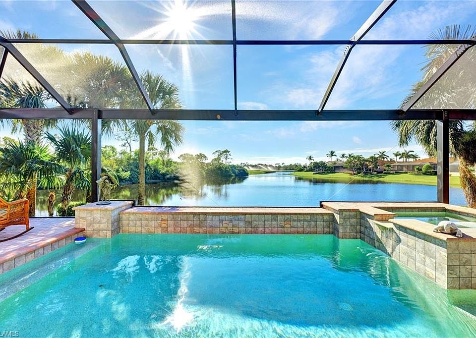 H12324. Amazing Expansive, Lake, Golf and Preserve view from your WCI custom 3 Bedroom, 2 1/2 Bath, Den Home with a 3 Car Garage and fantastic outdoor covered lanai living area that surrounds your pool and spa. Neutral colors throughout make this home easy to personalize. Features include all wood tile flooring, granite kitchen island great for entertaining, complete storm protection on the lanai that creates fantastic summer storage space, double oven, Masterpiece collection wood cabinets, crown molding enhanced coffered ceilings, custom designer light and fan fixtures, all windows and doors are hurricane impact, saltwater pool and spa, summer kitchen for afternoon poolside entertaining and a generous sized side entry 3 car garage. You have immediate privacy with the lush landscaping throughout Cypress Bend and the Preserve. Enjoy walking or biking to your private park to play Pickleball, Bocce Ball, kayak on Mullock Creek out to Estero Bay or meet for Book Club at the Community Center. You have the option to join Shadow Wood Country Club with 54 Holes of Championship Golf, 9 Har Tru Tennis Courts, Access to a private beach & Commons Club and more.