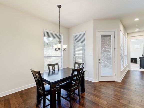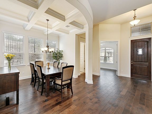Shady oaks treesFlat backyardHome officeHardwood flooringDedicated gardening spacesElegant formal dining roomGreenbelt views