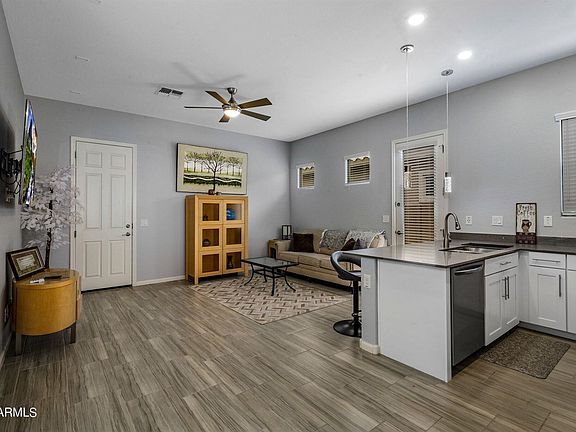 Don't wait to see this amazing energy-efficient home within a home! It offers a 1 bed/1 bath CASITA with a full kitchen, walk-in closet including laundry space with a stacked washer/dryer, large living space, a single-car garage, and its own entry door that is perfect for extended stay guests or vacation rentals! The main house features 2 bedrooms plus den which can be used as another bedroom, and 2 baths plus a spacious open concept floor plan. The kitchen features all stainless-steel appliances with plenty of white granite countertops, gas stove, and large island. The backyard includes a beautiful landscape including artificial turf, pavers, a fire pit, and Mountain View's. This house also includes SOLAR, tankless water heater, and plenty of smart-home features! Come see it for yourself