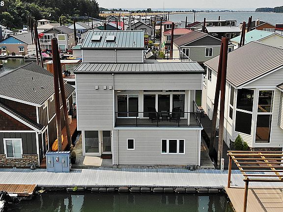 All 3 bedrooms w/ full bath in this custom flt hm built by Marc Even. Own BOTH sides of the dock + 9x57 storage space across the St! Enjoy views of river from 3 decks. High tech upgrades, including a whole-house sound system + Lutron brand lighting & shades. House incl finished boat well w/ heat & AC. 3rd bdrm on 3rd level w/large deck. Has CEMENT float. Earth Advantage Gold. Has low HOA fee of $310. This is a must see on the river!