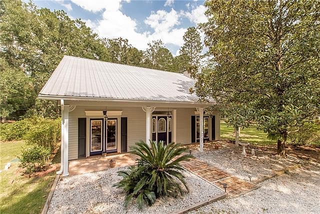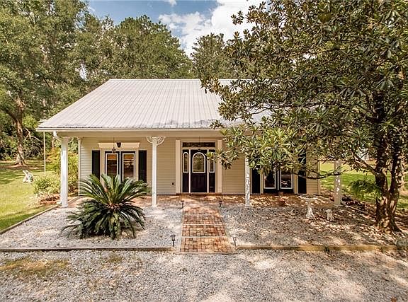 Charming Acadian home on quiet, 1 acre lot. Large living room, centered around a wood-burning fireplace; gorgeous galley kitchen w/ granite counters, plenty of cabinet space, and bay window; adjacent sun room leads to spacious, screened-in patio with wood-decking that wraps around it; master downstairs w/ ensuite bath; second downstairs bedroom could be flex space, has french doors leading to front porch; 2 upstairs bedrooms have new carpet and share remodeled bath; 2 storage sheds out back; FLOOD ZONE C!
