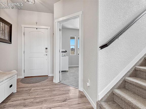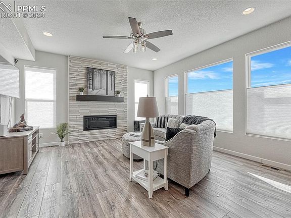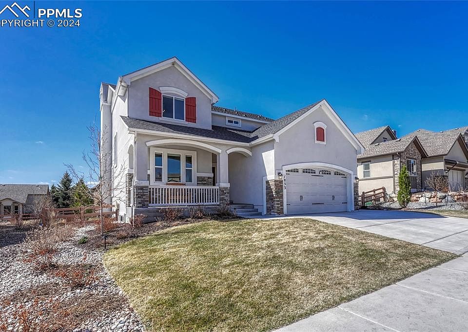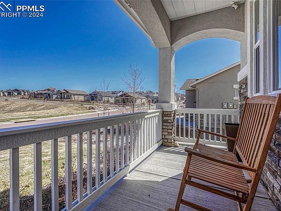 Prepared to be wowed by this stunning 2020 built Classic Sierra model 2-story home that includes: 5 bedrooms, 4 bathrooms, oversized 3 car garage, formal office, upstairs loft, stucco/stone exterior, covered front porch, mountain views, 6 panel doors, custom cellular blinds, and the list goes on and on. The attached kitchen overlooking both the dining and living rooms, feature designer 42” cabinets with crown molding, quartz countertops, stainless steel appliances (including a gas cooktop), subway tile backsplash, brushed nickel hardware, single basin kitchen sink, and a walk-in pantry. Attention to detail continues with luxurious touches like upgraded bathrooms throughout, main-level mudroom, wood shelving, smart home features including lighting, thermostat, and garage door controls, internet hardwire cabling throughout all levels, and custom black iron balusters adorn all staircases. You will also enjoy year-round comfort with central air conditioning and two gas fireplaces adorned with Knotty Alder box mantels. Upstairs you will appreciate the primary bedroom with attached en suite, 2 secondary bedrooms, a full bathroom, a loft, and an oversized laundry room. The finished garden-level basement extends livability with 2 additional bedrooms, wet bar rough-in, full bathroom, and a spacious family/rec room. The professionally landscaped exterior features 97 perennials/grasses, 65 shrubs, 10 trees, a butterfly garden, 3 raised garden beds, 3 sprinkler zones, a water fountain, and landscape lighting. A dedicated dog run is conveniently integrated into the concrete exterior backyard fencing, while a covered back composite patio offers additional outdoor relaxation space with privacy and its’ own gas line. Nestled on a cul-de-sac in the desirable Flying Horse Palermo community and conveniently situated near parks, D-20 schools, recreational facilities, shopping centers, restaurants, military bases, and entertainment options, this home offers the utmost convenience.