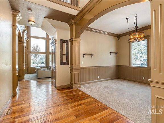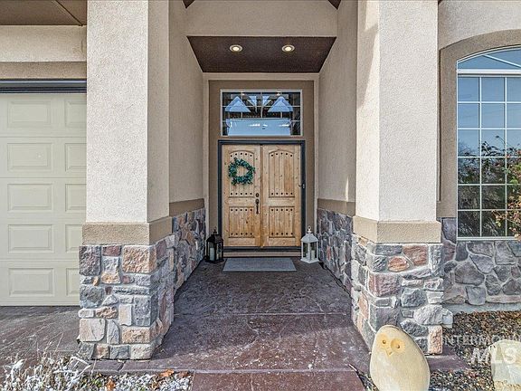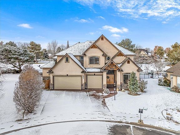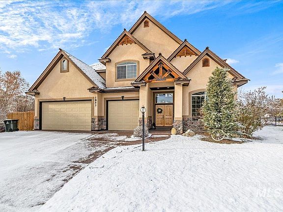 Welcome to the Meridian Chalet – a luxury home spanning 3500+ sqft, overlooking the 13th hole of Lakeview Golf Course. Modern design meets timeless craftsmanship w/ hand-scraped hardwood floors leading you to the heart of the home, the light-filled great room with remote-controlled custom Hunter Douglas blinds. Entertain effortlessly with a versatile dining space and a well-appointed kitchen. The main floor hosts the lavish primary suite. Upstairs, a den & a large loft with panoramic views overlook the great room for ease of entertaining. The three-car garage includes a golf cart for enthusiasts, and a private courtyard adds charm. The expansive backyard with a side patio and new Trex decking is perfect for outdoor living, complemented by automated sun shades for privacy on command. Proximity to shopping, schools, & easy freeway access enhances the lifestyle. The Meridian Chalet is not just a home; it's an invitation to experience Idaho living at its finest. Embrace the allure of this exceptional property.
