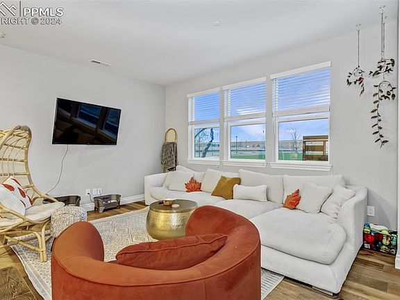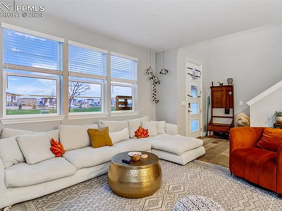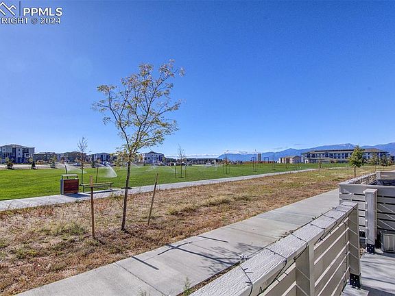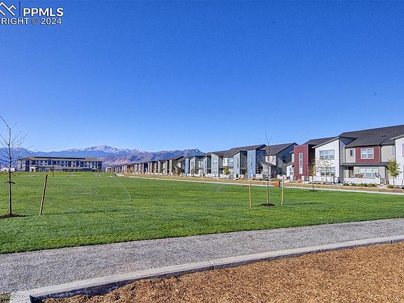 Remarkable Townhome sits prominently at the north end of Colorado Springs ~ ease of living with great views and a park directly outside your front door! Spacious main level living shows off all the builder's upgraded package: bright and fresh open concept living room, dining room along with the kitchen, featuring all stainless steel appliances, gas stove and gorgeous quartz countertops. High end cabinetry along with stunning Luxury Vinyl flooring. The upper level has three carpeted bedrooms, with an ensuite in the main bedroom and views of the Front Range; And your laundry is right where you need it - next to the bedrooms! Enjoy walking off the patio to the park trail with exercise stations and a playground with views of Pikes Peak! Great community with access to many restaurants, shops, entertainment and easy access to I-25 as well as Powers Blvd.