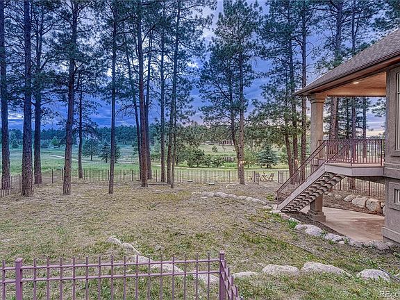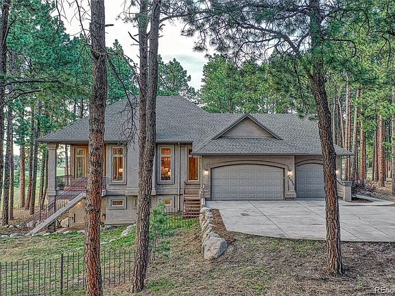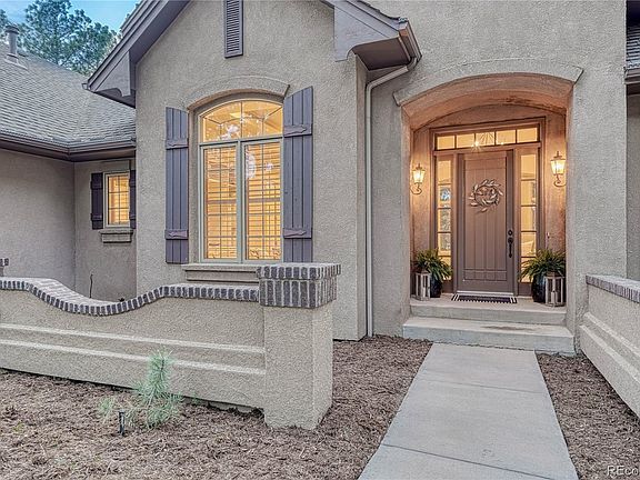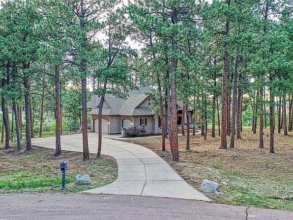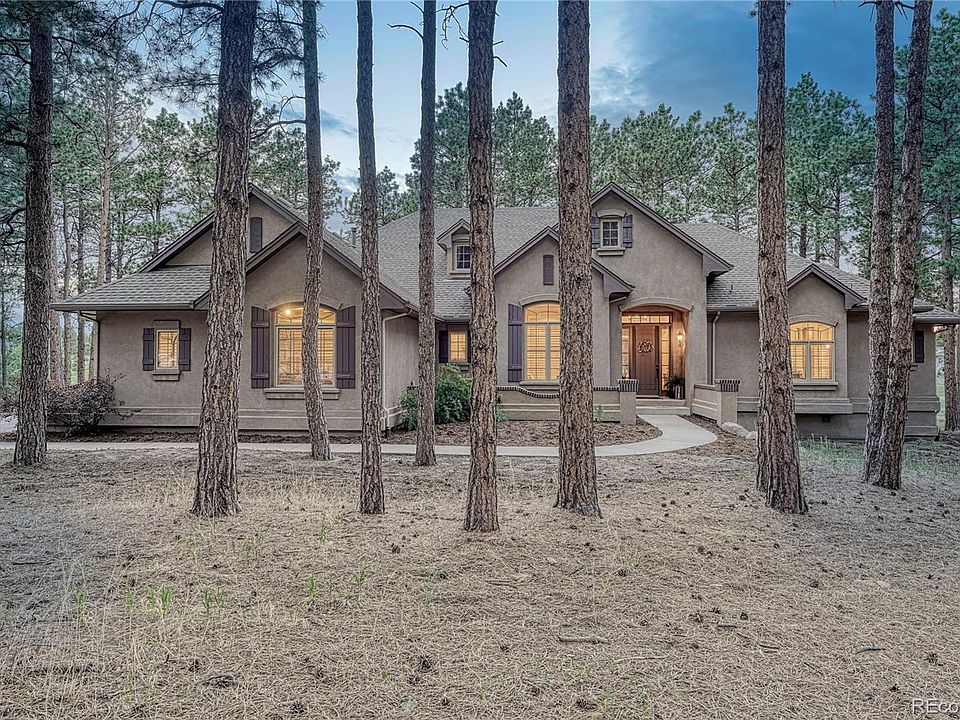 Gorgeous custom ranch with finished walkout basement nestled in the trees on a gorgeous 2 acre cul-de-sac lot in King's Deer. Loaded with luxury finishes: 12' ceilings on main/9' ceilings in basement, 8' doors on main, incredible gourmet kitchen, newly refinished cherry wood floors, new carpet, dedicated office, huge picture windows, & oversized 3-car garage. Enjoy views from the living room of the forest & large pond. Great room boasts architectural ceiling, gas brick fireplace, large windows & views. Spectacular gourmet kitchen offers a Wolf gas cooktop, vent hood & oven, an expansive granite island w/sink & storage & a walk-in pantry. Monogram refrigerator included! The adjoining dining space features 3 walls of windows, architectural ceiling, statement chandelier & walk-out to the covered deck to be enjoyed all four seasons. The office features 8' French doors, a beautiful arched window w/plantation shutters, built-in cabinetry & shelving. Main level owner's suite features beautiful views of the forest & pond. Adjoining bath offers his & hers vanities, 2 walk-in closets, space for a stackable washer/dryer, plantation shutters, window bench & a walk-in shower. Rounding out the main floor is the mud room/2nd office space w/cabinetry. Finished walk-out basement features 9' ceilings, access to the fenced backyard & 3 bedrooms w/walk-in closets & above-grade windows. 2 of the 3 bedrooms have an adjoining bath. 3rd bedroom has an adjoining bath roughed in. Tw large unfinished flex spaces provide opportunity for a variety of uses. Rounding out the basement is the laundry room w/cabinetry & a tile floor. Fantastic outdoor space for cooking, dining, entertaining or relaxing. Additional perks include a John Deere riding mower w/snow attachment, 2nd refrigerator, hot/cold spigots in the garage & leafless gutters. Ideal location just minutes away from Lewis-Palmer schools, Highway 83 & I-25. King's Deer includes miles of maintained trails, a sports field & golf course.