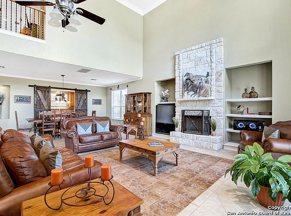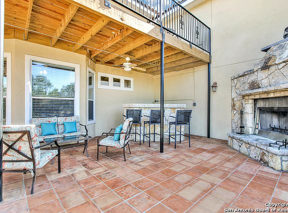 Beautiful Texas Hill Country home on 1 acre lot. Features include tall ceilings, barn doors , Tile flooring through out the first floor. Master down. Kitchen overlooks the back porch with outdoor fireplace and outdoor kitchen. Upstairs features loft area and with 3 bedrooms with one bedroom being used as a study. A media room comes off the 4th bedroom/study. The media room does have a separate entrance from study/bedroom or from outside and has a full bath. Could be a fifth bedroom. The upstairs loft area invites you to a large upstairs deck with unobstructed views. Great for entertainment or to just relax. The back yard is completely fenced and features a outdoor bar area, kitchen and fireplace. Drive way is extended to comfortably park several vehicles. Gated community just minutes to 1604 , dining and shopping.