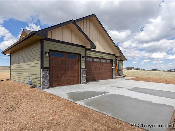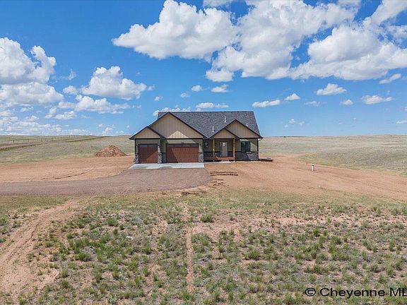 Welcome to this Gorgeous Triple Dot Home, where comfort meets elegance and the craftsmanship is in the details. The Cody Floor Plan offers a stunning design featuring vaulted ceilings, fireplace, 3 car attached garage piped for heat and inviting covered front and back porches. The beautiful hardwood floors, cabinetry and doors, radiate throughout creating a warm and inviting setting. The custom kitchen is a chef's dream showcasing a hidden pantry, granite countertops, under-cabinet lighting, and a stainless steel appliance package. The spacious master suite is a true retreat, complete with a luxurious five-piece bath and an oversized walk-in closet that will exceed your expectations. Nestled on a spacious 4.81 acre lot, this property includes breathtaking views and wide-ranging Wyoming sunrises and sunsets. It adheres to outbuilding and animal-friendly covenants, making it perfect for those seeking a rural lifestyle with modern conveniences. Enjoy seamless high-speed internet access and an easy commute with close proximity to I-25. This is more than a home; it's a lifestyle. Schedule your private tour today!