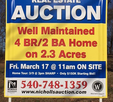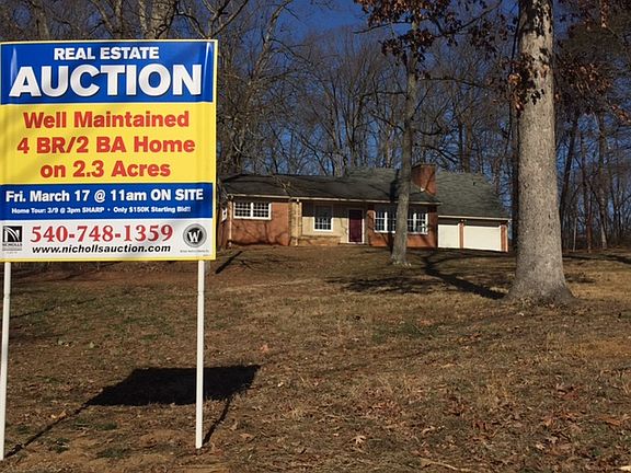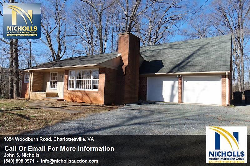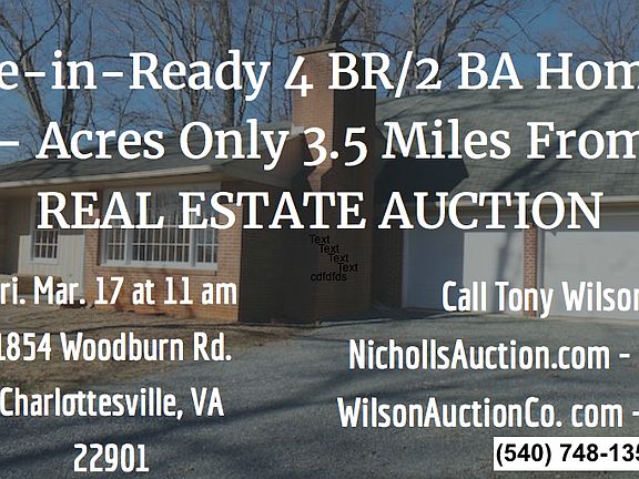 ***REAL ESTATE AUCTION*** List Price is starting bid only. Price to be determined at live public auction. Move-in-Ready 4 BR/2 BA Home on 2.3 +/- Acres Only 3.5 Miles From UVA REAL ESTATE AUCTION Friday, March 17, 2017 at 11 am 1854 Woodburn Road, Charlottesville, VA 22901 Price to be determined at Live Public Auction Well maintained 4 BR/2 BA brick home w/walk-out basement on 2.31 +/- acres only 3.5 miles from University of Virginia--Only $150,000 Starting Bid. Desiring to reduce their real estate holdings, the sellers have contracted us to market and sell this clean, solid and well located home at public auction. This wonderful home boasts an amazing location near schools, retail, medical facilities, restaurants and only 3.5 miles from UVA!! Take advantage of this rare opportunity to BID YOUR PRICE. - Move-in-ready 4 BR/2 BA brick home w/walk-out basement on 2.31 +/- acres (1,118 +/- sf. above grade and 1,118 +/- sf. basement) - Kitchen (all appliances convey); dining room; living room; Florida room; 2 car attached garage w/storage room above garage (500 +/- sf.) - Walk-out basement that is roughed in for an additional kitchen area (washer & dryer convey); basement has all new windows - Hardwood and vinyl flooring; kitchen has commercial tile flooring - Private well & septic system; heat pump for heating & cooling; 2 fireplaces (1 on main floor/1 in basement) - Rear enclosed patio w/slate; small front porch - This lovely home has been well maintained, and has fresh interior paint. Public water and sewer is accessible via the right rear corner of the lot. The Rivanna River Reservoir is located behind the home, and is accessible for fishing. - Location Highlights: 3 schools nearby; 3.5 miles from UVA; 4.5 miles from UVA Medical Center; 6 miles from Charlottesville Airport; close to retail, assisted living facility, doctor/dental offices, hair salon, pharmacy, fire station, banks, restaurants, shopping mall, grocery stores, automobile dealerships and much more. - Tax Map: 04500-00-00-02700; DB 1113/80; Zoned: RA - Only $150,000 Starting Bid. Property Tour: Thursday, March 9 @ 3 pm SHARP. Please contact Tony Wilson for more information or a private preview of the property (540-748-1359). For more information visit, www.nichollsauction.com Nicholls Auction Marketing Group VAAF 729