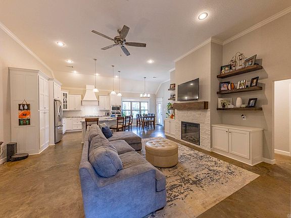 Welcome to this stunning home that is now available for sale in the peaceful Bryant school district. This beautiful property offers ample space for comfortable living. Step inside and be captivated by the open layout, stained concrete floors, and 12 ft ceilings. The kitchen boasts elegant granite countertops, a built-in gas stove top, and an island that opens to the living room perfect for preparing meals and entertaining guests. Cozy up in the living room with an electric fireplace insert, creating a warm and inviting atmosphere. The split floor plan offers privacy and convenience, with the master suite located separately from the other bedrooms. Upstairs, you'll find a bonus room that can be used as a playroom, office, or additional living space – the possibilities are endless! Situated on a large lot that backs up to green space, this property provides a serene backdrop and added privacy. Relax and enjoy the outdoors on the covered back porch or let your pets roam freely within the fenced backyard. This neighborhood is ideal for families, with an upcoming park and paved walking trails.