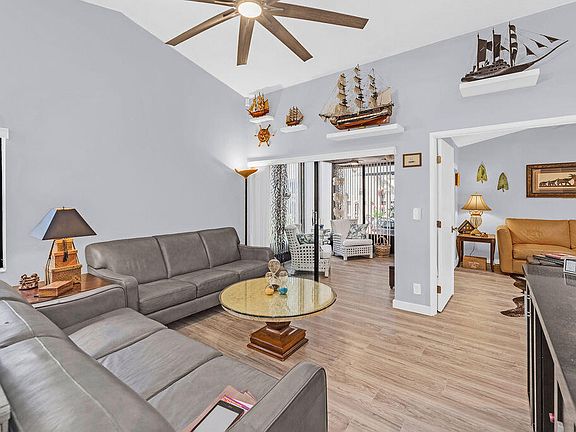 Rarely available true 3-bed 2-bath corner unit in desirable community. One of the largest models with cathedral ceilings and a split floor plan for added privacy. New floors and new hot-water heater. Spacious master suite with sitting area, double door entry, and huge walk-in closet. Relax in your glassed-in Florida room in the AC or walk out to your open private patio. Whisper Walk has a clubhouse, resort pool, spa, tennis, and pickleball. Clubs and card games, along with walking paths and lakes. Great community and a must-see unit!