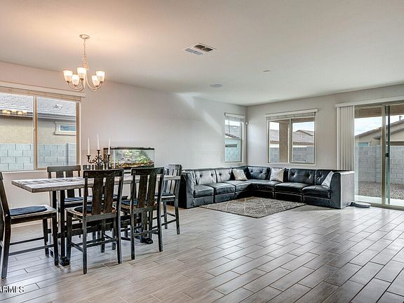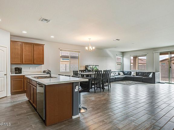 Gorgeous three-bed, two & half bath home with a den in the new community of Austin Ranch in Surprise. Built only two years ago, the home boasts an open floor plan with upgraded wood look tile throughout the living areas and professionally installed surround sound in the living room. Make yourself at home in the spacious kitchen, with stainless steel appliances, nice sized pantry and breakfast bar, perfect for additional seating and gatherings. Get ready each day with a roomy master bedroom, closet and bathroom, featuring double sinks and upgraded walk-in shower. Find plenty of storage space for tools and vehicles in your extended garage, as well as an RV gate to your freshly rocked back yard. Enjoy lower electric bills with solar as well! This home is priced to sell and won't last long.