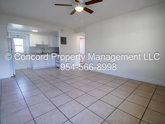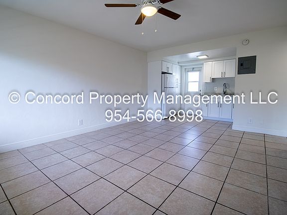 This apartment has a brand new kitchen and is fully tiled and features two A/C units. The large bedroom has a very large walk-in closet for your clothing and storage needs, and there is a closet just outside the bathroom for linens and additional storage. Monthly rent includes water, sewer, trash removal services, pool maintenance, pest control services, and landscaping. There is a first come/first served parking lot for residents on the north side of the building as well as ample street parking. FYI, the spaces in the front of the building along Adams Street are assigned and already rented by current tenants. We impose a limit of two people in a 1-bedroom apartment, and small pets up to 25 lbs are welcome - limit of two pets per apartment, and a 1-time pet fee (per pet) is additional and due at lease signing. Dog breed restrictions are enforced. The property is a great example of Mid-Century Modern architecture, and the Hollywood location is ideal - the property is situated just west of Federal Highway and gives you quick and easy access to the numerous restaurants and shops on Federal Highway, Hollywood Boulevard, and all the activities on Young Circle. The airport, I-95, and Port Everglades are just a short drive to the north for easy travel. The property itself boasts an internal courtyard hidden from the street with a lovely in-ground pool, a large brick paved patio area with picnic tables, and an on-site laundry for residents. Costs/fees: $80 non refundable application fee for anyone over the age of 18 Background screening required MINIMUM move in cost = 2 months rent (first full month of rent + 1 month of security) Contact: Concord Property Management, LLC Contact for details.
