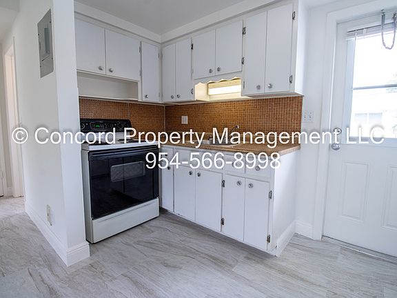 Summer Special- 2 weeks free with immediate move in! This unit is fully tiled, has 2 new a/c units and is available for immediate move in. The large bedroom has a very large walk-in closet for your clothing and storage needs, and there is a closet just outside the bathroom for linens and additional storage. Monthly rent includes water, sewer, trash removal services, pool maintenance, pest control services, and landscaping. We impose a limit of two people in a 1-bedroom apartment, and small pets up to 25 lbs are welcome - limit of two pets per apartment, and a 1-time pet fee (per pet) is additional and due at lease signing. Dog breed restrictions are enforced. The property is a great example of Mid-Century Modern architecture, and the Hollywood location is ideal - the property is situated just west of Federal Highway and gives you quick and easy access to the numerous restaurants and shops on Federal Highway, Hollywood Boulevard, and all the activities on Young Circle. The airport, I-95, and Port Everglades are just a short drive to the north for easy travel. The property itself boasts an internal courtyard hidden from the street with a lovely in-ground pool, a large brick paved patio area with picnic tables, and an on-site laundry for residents. Costs/fees: $80 non refundable application fee for anyone over the age of 18 Background screening required MINIMUM move in cost = 2 months rent (first full month of rent + 1 month of security) Contact: Concord Property Management, LLC Contact for details.
