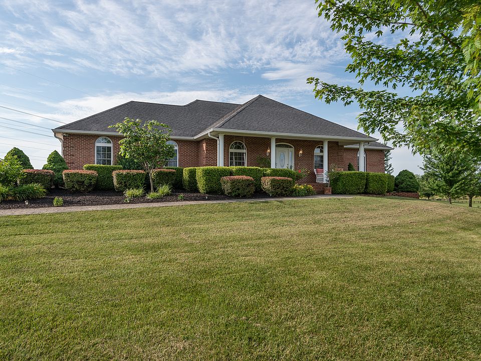 Country living at it's best! Situated on 5 beautiful acres, within minutes of Nicholasville, Lexington and Versailles. Well maintained all brick ranch on full walkout basement, custom 30X36 barn/shop with new auto lift. This home has something for all! Lovely stamped concrete walkway and front porch with brick trim, inviting you to just come, relax and enjoy the countryside and lake views. This quality home features a large master suite, with shower and jetted tub, formal dining room and home office. The chef in the family will love the large country kitchen with stainless steel appliances, kitchen bar area, granite counter tops, island with prep/bar sink, and extensive cabinetry. Open to the family room with fireplace with pellet stove insert and laminate wood flooring. Huge back deck provides great views of the countryside. The lower level consists of a large family/rec room with coffered ceilings, porcelain plank tile flooring, fireplace with wood burning insert, wet bar, rec area, full bath, bonus room, and huge storage areas that could be expanded for additional living space. New high efficiency heat pump water heater (2016). New HVAC in 2013. Brand new 16KW whole house generator installed 2018.