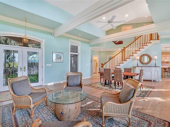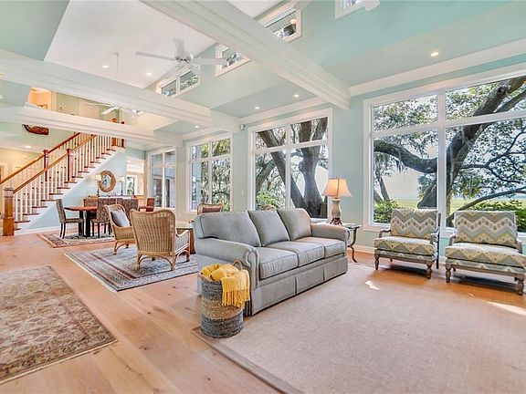 Spectacular views from every corner of this home. Rare opportunity to own a waterfront home in gated fly in community with it's own on site 48x36 solid block custom hanger with A/C, office space and half bath. 2736 sqft home is situated on 1.1 acre waterfront lot where tides, marsh, rivers, oak trees and sky will hypnotize you. This is a one of a kind custom built home, a true gem. From the moment you enter, you are greeted by the natural beauty of the coast through the 2-story living, dining and sitting areas with dramatic floor to ceiling windows and beams. New wide plank wood flooring flows through main living area. Fully furnished gourmet kitchen includes beverage cooler and double oven. Master bedroom and office on main floor. Master bath has double vanity, whirlpool tub and walk in shower. Home also features a detached 2-car garage, combined large laundry and mud room. Community filled neighborhood with airstrip, pool, tennis courts and community dock. You will not want to leave.