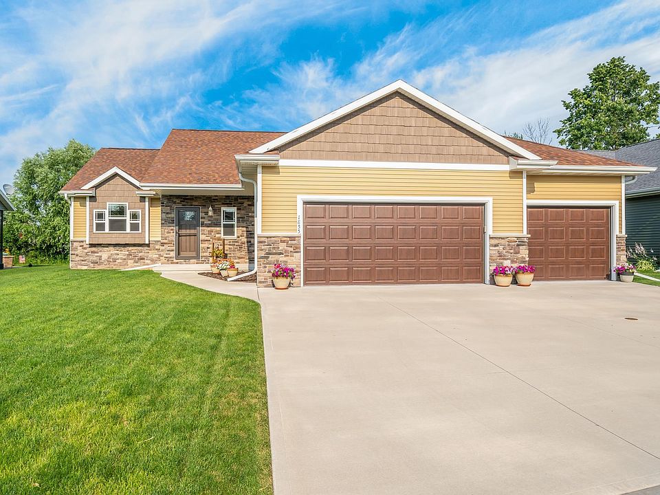 Stunning 3 bed 2 bath ranch home located in a quiet cul-de-sac that offers a country setting feel. Featuring open concept, split bedroom floorplan, hardwood floors, lg kitchen island, granite counters, pull out shelving in kitchen cabinets, walk-in pantry, living room with soaring 9’ ceiling and an abundance of windows for natural lighting. Primary ensuite has tray ceiling, lg walk-in closet, walk-in shower and a free-standing soaking tub. Drop-off area and laundry room conveniently located as you enter from your 3-car attached garage. LL is stubbed for bathroom and has egress window for future expansion. See sellers update list.