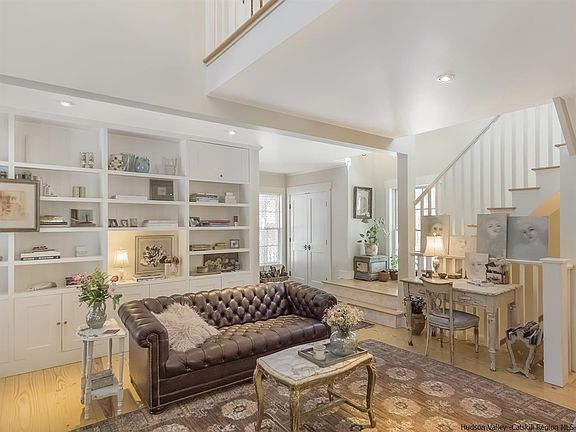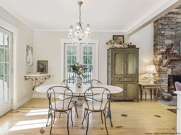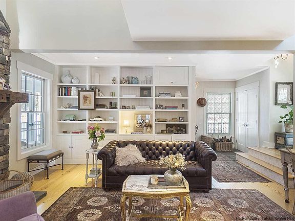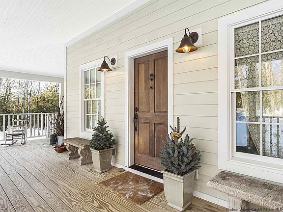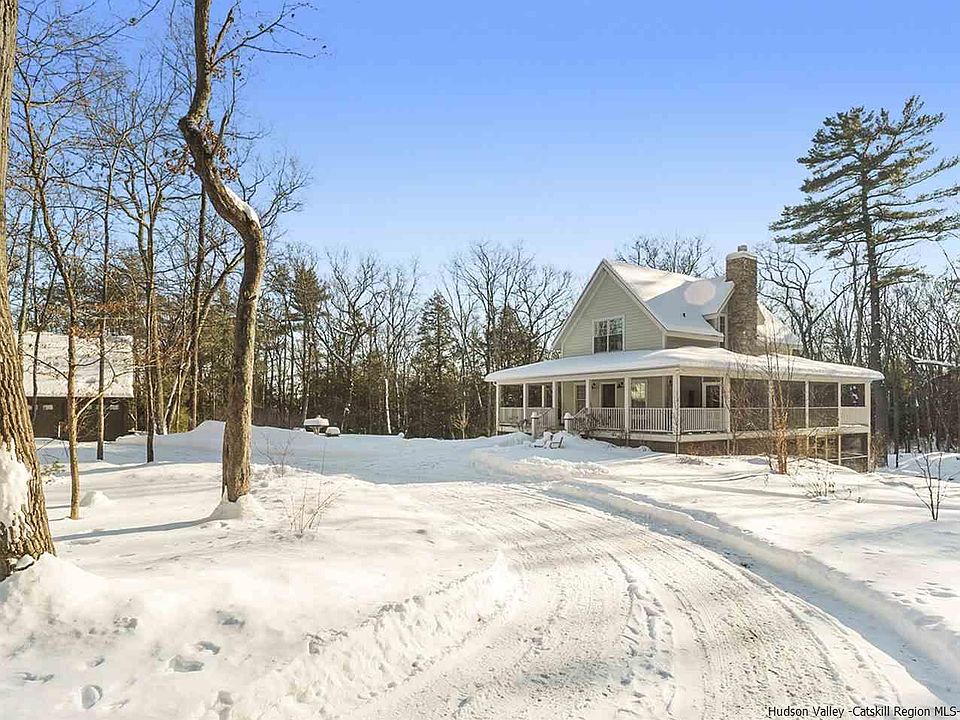 Just in time, discover this immaculate, contemporary custom designed farm-home. It was created by the Sellers to allow the Catskills' pure and lovely country light to shine throughout, so that truly, outdoors is alive inside the house with its' numerous custom finishes. Upon arrival, step into the welcoming blue-stone entry hall with generous closet, and half bath and then enter the spacious double story living room. From every room on this main floor one has access to the full house wrap-around porch- which primarily faces a pristine woodland, rocky outcroppings, garden and babbling brook. An impressive floor to ceiling stone fireplace & chimney extends up through the open two story ceiling with balcony on the second floor. The landscaping has been lovingly tended. There are wonderfully fanciful trails winding through the woods, over an arched bridge, to a little meadow- all this is surrounded by large acreage insuring peace & privacy. I love the two story living room area and second story landing open to the bold fireplace wall & life below. There is an open dining and the prettiest cooks kitchen which blends both luxury & function. Additionally on the main level, there are three french doors which open to the porch for fresh air, views, casual conversation and dining. An inviting large family room and third sleeping area with a full bath are located on the lower level. From here step enter the screened porch or go directly outside. Privately set off from the two other floors this space is perfect for a home business, yoga studio or wonderful family room - complete with propane fireplace. There are so many options for this large, spacious room designed for amusement and relaxation. The propane fireplace a natural for cozy evenings. Here you'll discover a terrific laundry area.There is also a detached two car garage with a studio, guest or work space above it. Every detail in this contemporary country home enhances your Woodstock lifestyle. And, it is all a simple 5 minutes to the village, shopping, restaurants and galleries. When it is said, "a picture says a thousand words.." it is safe to say that the photographs here hardly convey the homes pristine atmosphere.