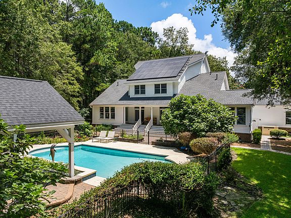 Classic Lowcountry home situated on 15 high acres in one of Wadmalaw Island's favorite gated, waterfront neighborhoods, Longcreek Plantation. This home feels like a private resort or retreat with its own amenities such as saltwater pool, cabana, guest house, garden, greenhouse, and golf cart/walking trails. Enjoy the privacy of acreage, the comfort of a gated community, and access to the brand new community deep water dock. Elegant brick pillars and white fencing are most welcoming for the drive up to the home. This home has classic Lowcountry style and architecture, with a full front porch, columns, and operational custom metal shutters. Each room in the home feels grand in size with a traditional, yet open floor plan and plenty of custom millwork details. There is a large welcoming...foyer that showcases the dining room, formal living room, as well as the large great room. The formal living room has handsome mahogany details including wainscoting and built-in bookshelves. The dining room has wainscoting and a formal chandelier and is conveniently located just off of the kitchen for entertaining. The magnificent great room has coffered ceilings, built-in bookshelves and cabinetry, wet bar with granite countertops, and an electric fireplace with brick hearth and custom mantel. There are sliding doors on either side of the fireplace showcasing the view of the fabulous landscaping, pool, and cabana. The spacious and open kitchen was built for hosting, with granite countertops, bar stool seating, white cabinetry, stainless steel appliances including a gas Wolf six-burner cooktop, and wall oven and microwave. There is also a built-in desk area and tons of cabinet storage. The kitchen includes a more casual breakfast area overlooking the stunning yard and pool. Just off of the kitchen and breakfast room is a sunroom with tall vaulted beadboard ceilings and ceramic tile flooring. This sunroom can be used as an extra living space, office, or sunroom. It is currently being used as a music space. The laundry room/mudroom is conveniently located with the garage door access. The laundry room has built-in cabinetry for storage, a laundry sink, extra refrigerator, front loader washer and dryer, and plenty of folding counter space. The primary suite is on the first floor and is privately located on the right side of the house. It has tall tray ceilings and is large enough that it can accommodate a sitting area and also has private outdoor access to the back porch. The renovated primary bathroom has ceramic tile flooring, white subway tile zero-entry shower with custom glass enclosure as well as a rain shower head and separate handheld. There are two separate vanities with granite countertops, modern freestanding tub, and custom drawers built into the studs/wall. There are two separate, large, walk-in closets as well as a private water closet. Upstairs there are three large guest suites all with their own en suite bathrooms. Central to the guest bedrooms is an open living room for guests to enjoy as well as a bar/crafting area/office space. Each bedroom has walk-in closets and tons of storage throughout the entire house. There is a three car garage with electrical panel equipped for EV charging. The covered back deck of the home overlooks the fenced in pool, paver patio area, and pool cabana. The back yard has lush and mature landscaping and a fabulous saltwater pool with plenty of pool deck area as well as a covered pavilion/cabana. The covered pavilion has plenty of room for grilling, lounging, and dining while enjoying the pool and this home's beautiful private outdoor living. There is an outdoor shower to enjoy after a long day outside! There is a perfect guest house that matches the main house in lowcountry style. It has a living area, two bedrooms, and full bathroom. This charming guest cottage is currently being used as a home office, gym, and air conditioned workshop. This property also enjoys a private garden and pergola as well as a greenhouse. This home has a whole house generator, solar panels on the roof, fully encapsulated and dehumidified crawlspace, new roofs on main house, guest house, and pavilion, and EV charging capability. This property also has its own trails around the 15 acres for the most fun golf cart rides and walking. This home is in an X zone and does have a large portion of the property zoned as AGR. Longcreek Plantation has a brand new deepwater community dock for all residents to enjoy. SEE ATTACHED FLOOR PLANS AND VIRTUAL TOUR!!!