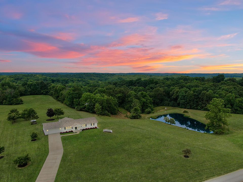 This gorgeous 4.85 acre property with a large, stocked pond and a detached 32x40 three car pole building is one that you definitely do not want to miss! Updated flooring, solid oak kitchen cabinets, and new windows highlight just a few of this home's main attributes. The main floor features two large bedrooms with a full bath on the primary suite and a possible bonus third bedroom or office. The dining room features double doors that look out into the spacious backyard that grow several apple trees. The full basement includes an instant hot water tank, wood burner, ultra high efficiency furnace, double doors and can be converted into additional living space. This home has a new public water line (spring water as a secondary source) and has been freshly painted on the inside and out.