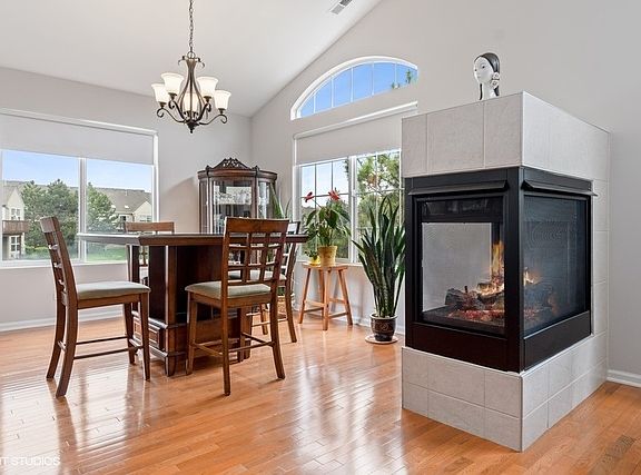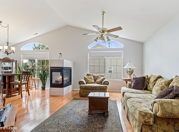 This awesome 2nd-floor ranch offers light and airy open floor plan with vaulted ceilings and lots of natural light. Wood floors throughout. Enjoy entertaining in this wonderful kitchen with an island, pendant lighting, white cabinets, walk-in pantry and plenty of storage. Enjoy cold evenings with the double-sided gas fireplace. Large master bedroom with vaulted ceiling, updated private master bath with jacuzzi tub and a ceiling fan. Large walk-in closet in master. The 2nd bedroom has a nice sized walk-in closet and is next to a full bath. Enjoy morning coffee on the large balcony overlooking green space. This home boasts a 2 car garage with shelving for lots of storage. Convenient to shopping and much , much more. Property is located in sought after Oswego schools. Schedule your appointment today.