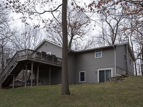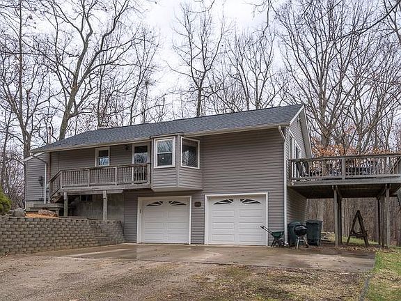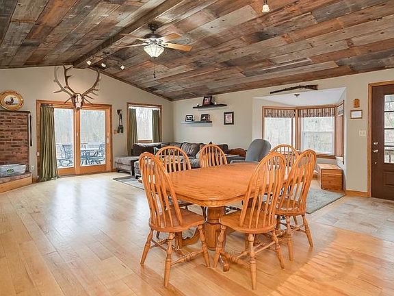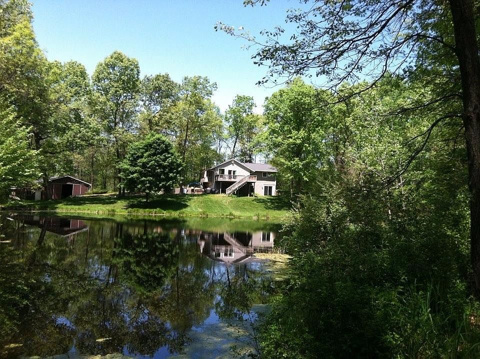 Updated raised ranch with walk-out lower level on 10 wooded acres with pond and 40x40 concrete floor barn. Wide open great room/eating area and kitchen with vaulted barn wood ceiling and sliding doors to a large deck overlooking the pond and woods. The great room has wood floors and the kitchen and entry are tile. Wood burning stove can heat the upstairs if desired but forced heat is available. Updated kitchen features, solid counters, Bosch gas cook top in large island, stainless appliances and recessed lighting. Off the kitchen is an oversized mud room and washer and dryer. Master has full bath and walk in closet. Lower level walk out has a wet bar, bedroom, half bath, large open family room with sliding door leading to the pond. There is a great work bench/hobby room and access to the 2+ car garage with plenty of storage. Fruit orchard and apples, pears and peaches. There is plenty of wild life and nature in this secluded setting.