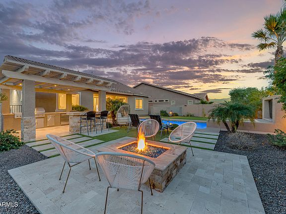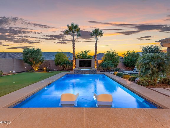 The backyard unfolds like your personal desert resort, wrapped in travertine and designed for year-round enjoyment. From sunrise over the Estrella Mountain Range to sunsets on the foothills, the mountain views here are panoramic classic Arizona in every direction. The modern heated pool with spa overflow and new color-changing lighting (2024) is anchored by a custom 85" outdoor TV wall (2023) ideal for sports, movies, and evenings under the stars. A gazebo-style outdoor kitchen with bar seating, a cozy gas firepit, a PGA-grade oversized putting green, and a 600 sq ft gated/upgraded pet-turf dog run complete an entertainer's dream layout. Fitness enthusiasts will appreciate the dedicated turfed in-home gym featuring Govee sound-reactive recessed lighting (2024). Turn-key home gym setup can convey (turf, rack, plates, dumbbells, & sauna).