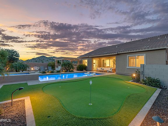 Welcome to one of Estrella Mountain Ranch's most complete lifestyle homes—a true private resort positioned at the end of a cul-de-sac with uninhibited foothill views, a fully independent guest casita, a modern heated pool + spa, a PGA-grade putting green, a turfed in-home gym with sauna, and a long list of 2023-2025 upgrades that elevate both function and luxury. Just steps from Estrella's top trailheads and the FINS mountain biking track, this property delivers rare privacy, versatility, and recreation in one seamless package. The home begins with the coveted 2018-built Lennar Oracle floorplan, offering an ideal balance of openness and thoughtful separation. The main residence includes 3 bedrooms and 2 bathrooms, freshly updated with new interior paint (2025), wood-look tile flooring throughout, new carpeting (2025), modern black fixtures, drapery, and sleek under-cabinet kitchen lighting. The kitchen is finished with stainless steel Frigidaire gas appliances, creating a polished and highly functional main living space.