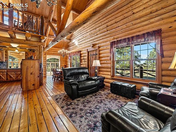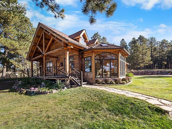 Custom Hand-Scraped Log Home on 5 Acres in Black Forest with Pikes Peak Views This charming custom log home offers 2,121 square feet of living space and sits on 5 acres of beautiful land, complete with stunning views of Pikes Peak. The main floor features a two-story living room with a side-loading wood stove, a spacious sunroom, and a welcoming front porch. The kitchen boasts custom cabinets, while the home includes two bedrooms, two bathrooms, and an oversized two-car garage. A beautiful attached family room is perfect for gatherings, and a convenient mudroom/laundry area is located near the garage. The upper level includes an expansive room that could easily serve as two bedrooms or a large bunk room. You'll also find a 3/4 bath and a cozy loft area that can be used as a charming sitting space. Additional structures on the property include a storage/shop space and a barn with stalls. The property is surrounded by mature pine trees and open, fenced pastures. The main level features a bath with a clawfoot tub, a concrete tile roof, and a copper sink. Electric baseboard heat ensures comfort throughout the home. This turnkey property comes with included appliances and is ready to move in!