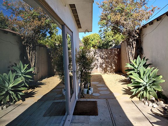 Sunn;y mid century apartment with private wraparound garden. Large living room with floor to ceiling windows and sliding doors. Private entrances to yard and front door and one to parking space. Modern kitchen with refrigerator, stove and dishwasher. Starbucks nearby and only 8 blocks from the beach. Quiet and sunny yet close to amenities with parking.