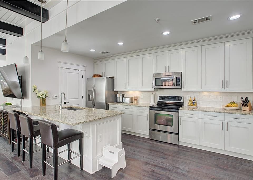 - Features: Breakfast Bar, Cabinets White, Eat-in Kitchen, Pantry Walk-In, Stone Counters, View to Family Room