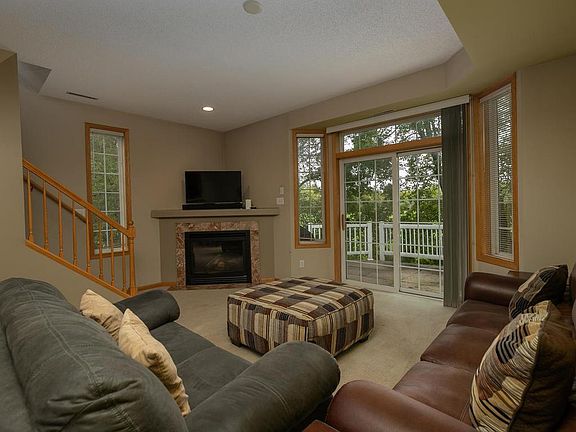 Hard to find end unit town home with two bedrooms upstairs with a full pass through bathroom. Sliding glass doors open to patio and lots of open green space behind you! Gas fireplace for the cold fall days, and open concept living and dining. New washer and dryer, new water heater and water softener. Association takes care of all outside maintenance, snow removal, and lawn care/easy living/low maintenance. Close to the city trail system!