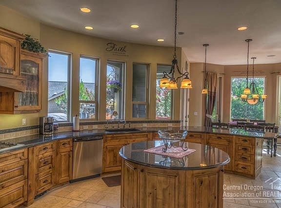 Custom 4000+sf Beauty in Eagle Crest Resort! 4Bd +Office & 3.5Ba home features: soaring vaulted ceilings, extensive travertine flooring, great room w/stone gas FP, Kitchen w/slab granite, SS-appl, center island +B-Bar, knotty-alder, bay-window b-nook, formal dining w/distressed HW floor, 2-suites includes grand master w/bay window, private balcony, dbl vanity, walk-in, tiled soaking tub & huge 2-person shower, stone fascia accents, landscaped w/big paver patio & HUGE 4+car attached garage all on 0.36 acres!