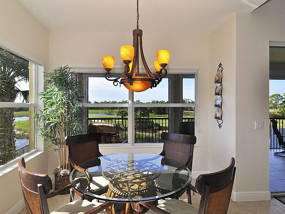 This 3101 square feet corner coach home has tremendous views of the 17th peninsula green, which is surrounded by lake, with the 7th fairway and preserve back drop. Granite countertops with tall cabinets with crown molding. Two car garage, 3 bedrooms and study with tile and carpet thru out. Tiled lanai with electric roll down shutters. Part of member owned 3 golf courses. You will sit on your lanai watching nature and the sun setting. Play area, fishing pier on Mullock Creek with canoes and kayaks. Eight foot sliders with tall ceilings make a statement when come up from foyer.