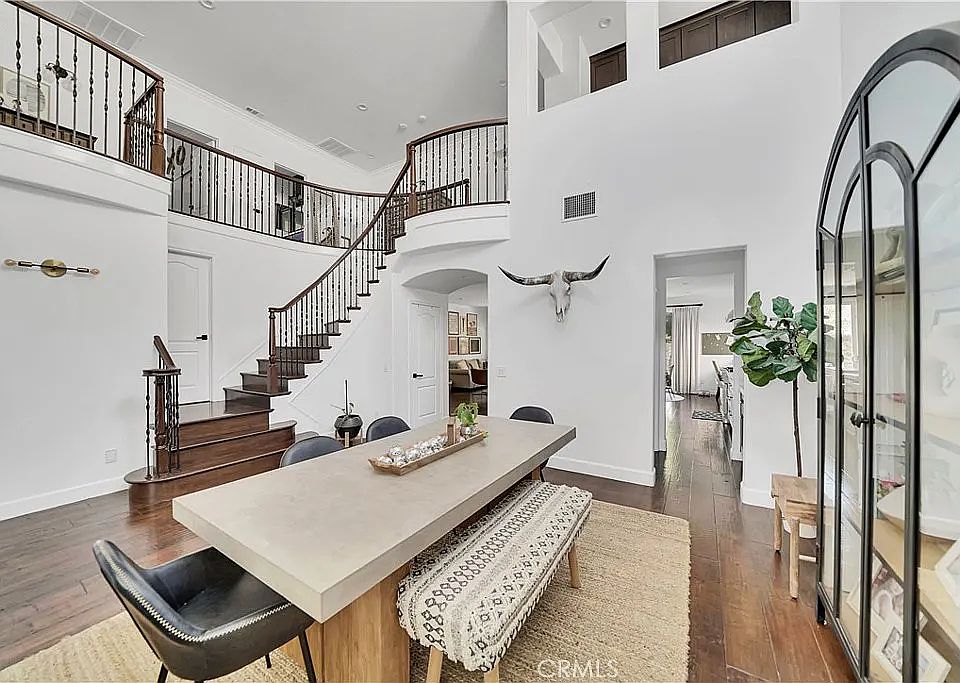 Enjoy rich hardwood floors, crown molding, plantation shutters, vaulted ceilings, recessed lighting, and designer paint throughout. The formal living room features a coffered ceiling flowing into an adjacent formal dining space.